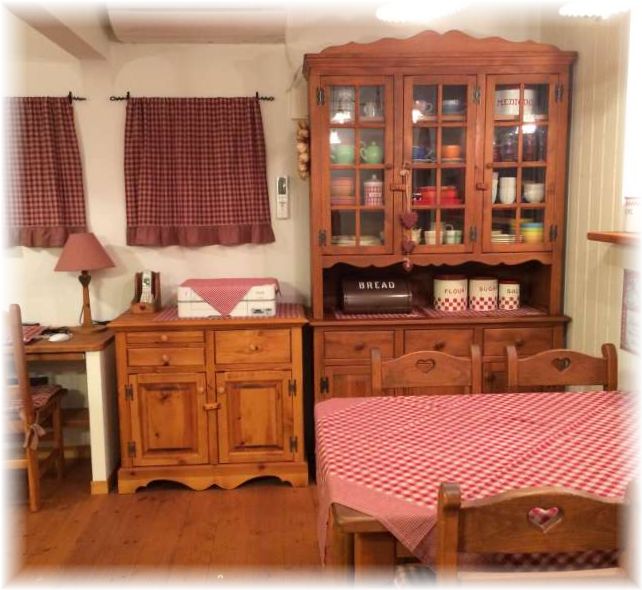 主にパイン材で作られた家具を基調とし、アクセントとしてロッキングチェア、黒いねじり鉄の金具、花柄や植物柄のカーテン、パッチワーク等がインテリアとして使われます。