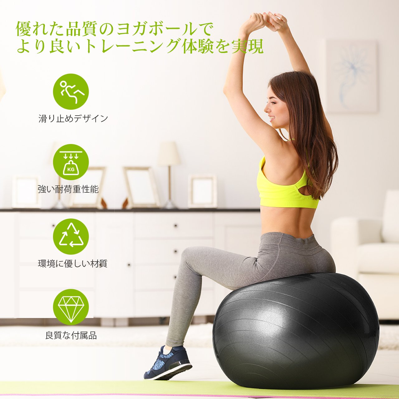 座るだけでエクササイズ効果が得られ、 室内でも出来るので天気に関係なく行う事ができます。 バランス、筋トレ、脂肪燃焼運動など幅広く様々な方法で運動ができます。 自分のタイミングで自由に豊富なエクササイズが可能、全身を簡単に鍛えられます。 参考:65cmサイズ\2,000以下
