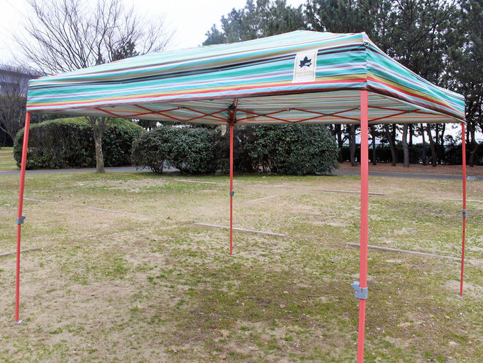 カラフルなストライプ柄は目立ちますね。テント自体がUVカット加工となっているため日焼け対策にも良いですね。サイズは270×270となっていますので4人程度でですとゆったりと使えますし家族でアウトドアでお出かけの時にはおすすめですね。またロゴスでチェアーも販売されていますがストライプ柄でありますのでテントと合わせるとおしゃれですよね。