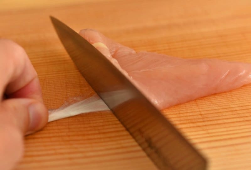 基本のささみ冷凍保存の方法をご紹介します。まず、ささみの『筋』を取ります。筋の端に包丁を入れます。筋がささみの下に来るように置き、左手で筋を持ち、包丁を筋と身の間に入れて引っ張るように筋を取ります。