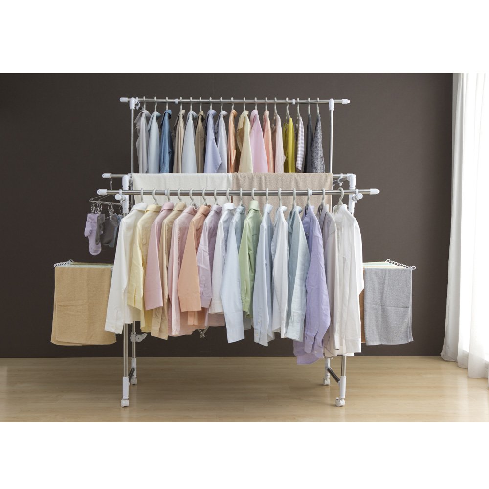 伸縮タイプの特徴としては幅や長さを調節することが可能なので、洗濯物の量によってサイズを変えることができ、室内干しでも邪魔になりにくい。室内用洗濯物干しの中では大容量のものもラインナップしている。