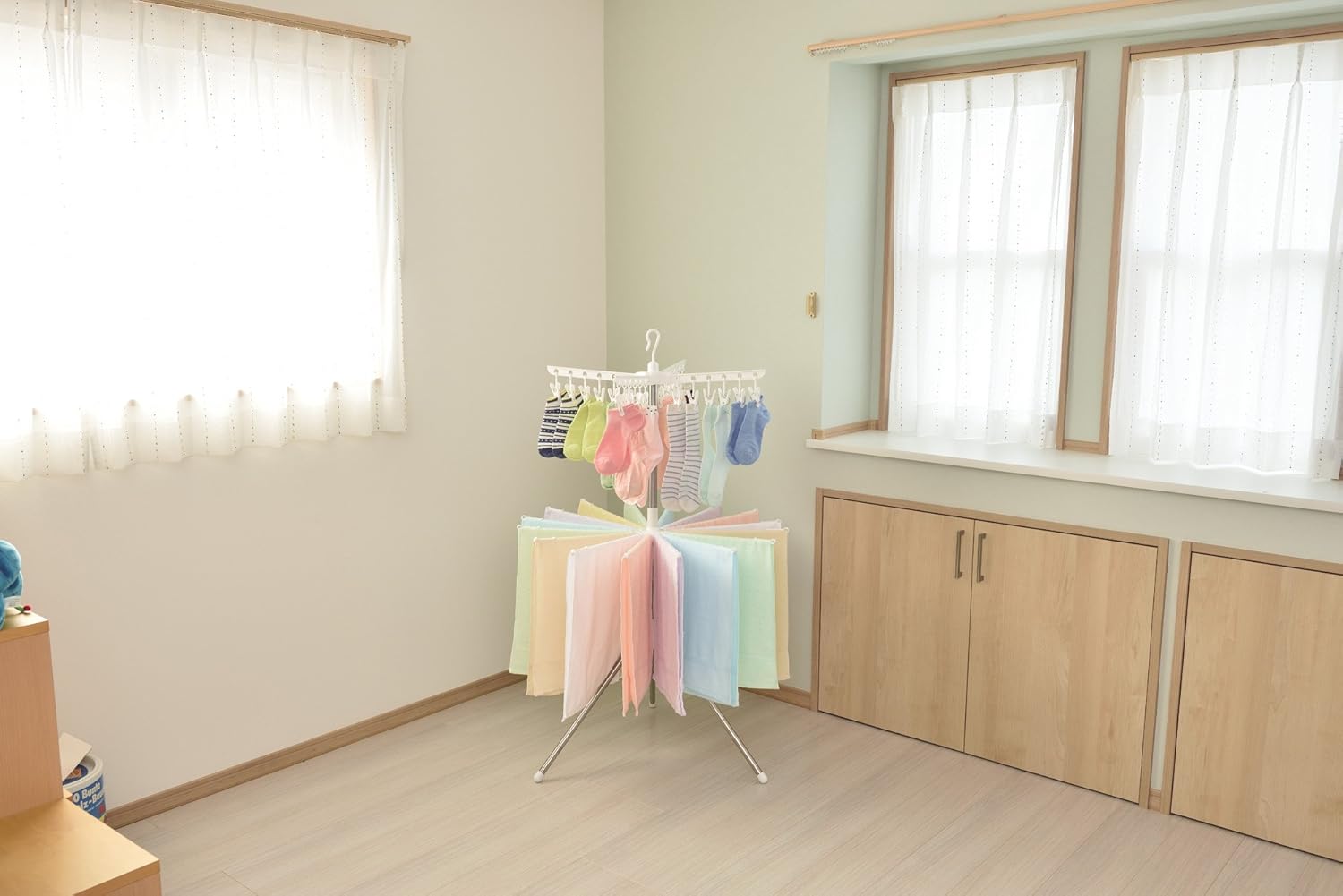 パラソルタイプの室内用洗濯物干しは足を広げた範囲しかスペースを取らないので省スペースで洗濯物を干すことができます。天馬のスタンド物干しパラソル型は上段に24個もの洗濯バサミを付属したピンチハンガーがあるので小物などを干す時にも困りません。また、ピンチハンガーは取り外しも可能なので洗濯の幅が広がりおすすめです。