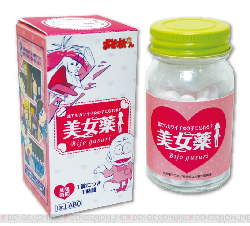 アニメ『おそ松さん』第1期10話『イヤミ チビ太のレンタル彼女』に登場した薬です。1錠で1時間、美女に変身することができます。アニメでイヤミとチビ太が服用し、女体化しました。