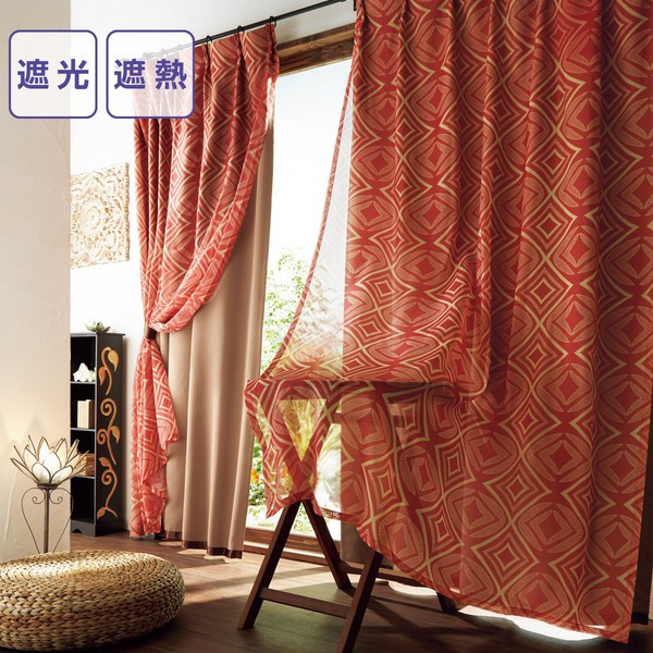 アジアンエスニック調のレースカーテンです。普通、厚手のカーテンを部屋側に、レースカーテンを外側にしますが、あえて厚手のカーテンを無地なものを選び外側にすることで部屋のコーディネートとしてエスニックテイストが楽しめるように。夏の熱を遮断するにはやはり厚手のカーテンが必要になりますが、内外を逆にするだけでコーディネートにも幅が生まれます。