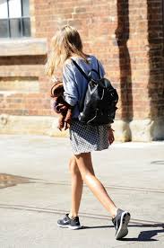 素足にミニスカート、フェミニンな印象のスタイルですが、スニーカーとリュックをプラスすると全体が引き締まり、ヘルシーなコーディネートに。