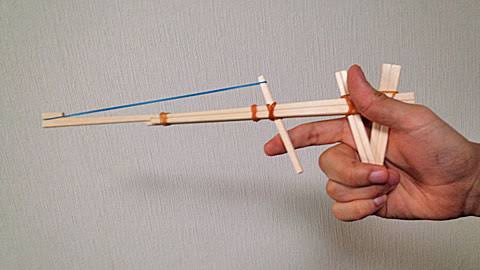 割りばしの間に入れ込んだ割りばしが前後に動くように調整して、鉄砲の先に輪ゴムをセットできれば完成です。飛び出す輪ゴムをセットする先は、少し削っておけばズレにくく簡単に輪ゴムをセットできます。鉄砲は複雑な構造のように見えますが、意外に簡単に作れますのでトライしてみましょう。