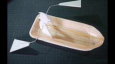 とても良く考えられている、輪ゴムを利用した工作です。車のタイヤと同じ発想になりますが、タイヤではなくオール部分に輪ゴムを取り付けることで進んでいきます。遊びで作るには、こうした発想までは浮かびにくいですが、是非真似をして作ってみましょう。真似をして作ることで、また新たな発想が湧いてくるはずです。幼児用の輪ゴム遊び道具としても活用できます。また、幼児期の能力を高めるのにも、こうした工作はとても活用できます。