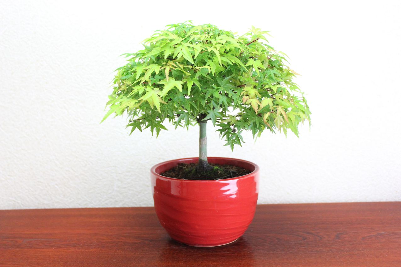 真っ赤に色づく紅葉ですが、真っ赤な鉢に植えてみるのもいいですね。実は紅葉は、新緑の時期の生き生きとした葉っぱはとても美しく、生命力を感じさせてくれる植物でもあります。新緑の青々として雰囲気を十分に活かせる鉢植えですね。大きくなってきたら、お部屋のコーナーなどに置くとおしゃれです。