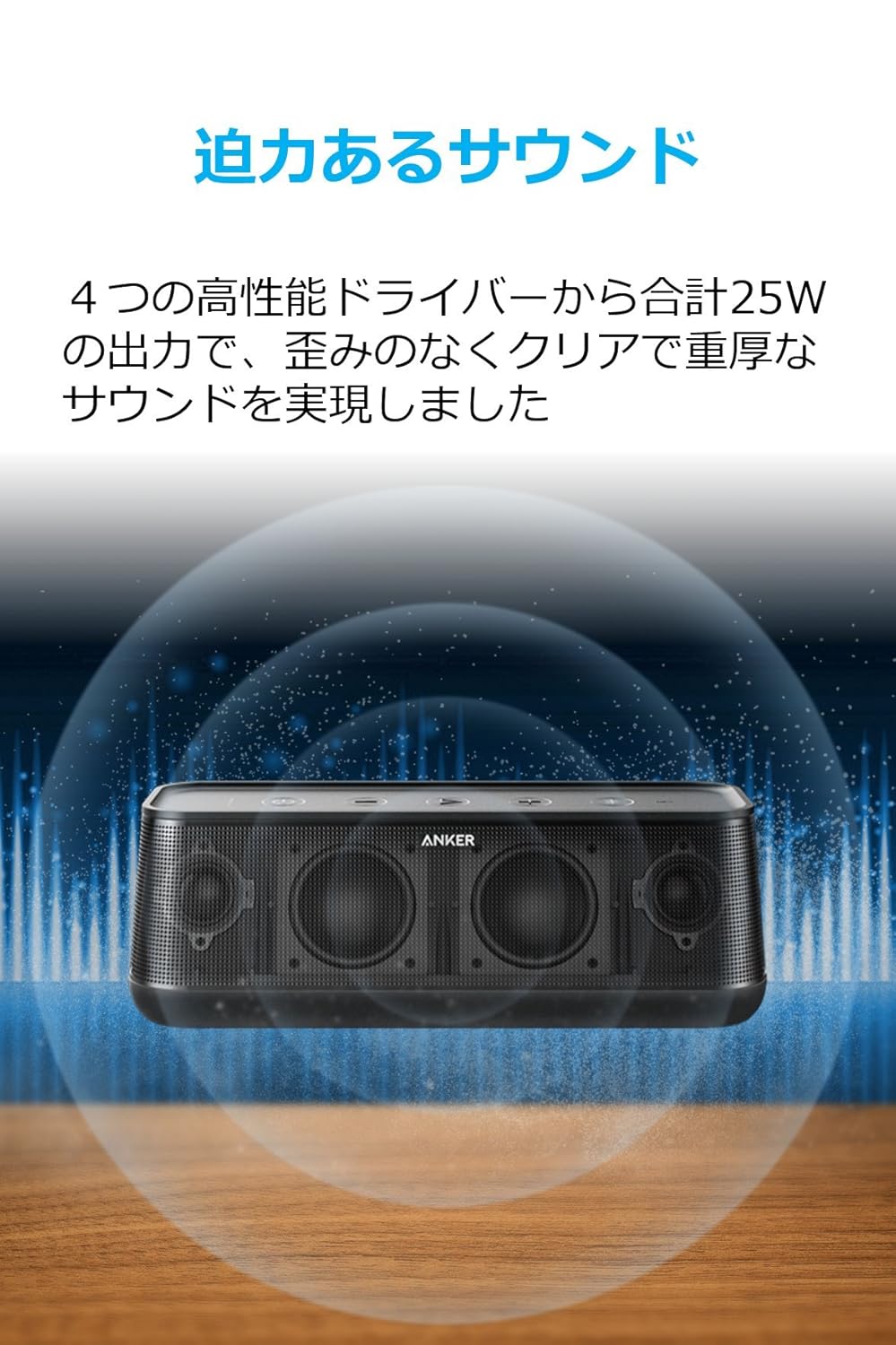 13000円台のびっくり価格で、高級感のある音を再現できるのがアンカーのSoundCore Pro+です。小型機とは段違いの迫力あるサウンドが魅力。パッシブラジエーターが2つ搭載されており、25W出力と、おうちの中で聴くには必要十分なスペックといえます。この価格でここまでの高音質を再現できるのはすごいこと。コスパの面では最高の機種と言えます。ただし重低音を重視する人には物足りないという声もありますので、ご参考に。